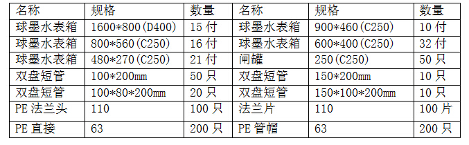 1、采購(gòu)內(nèi)容:球墨水表箱、雙盤(pán)短管、閘罐、PE法蘭頭、PE直接等
