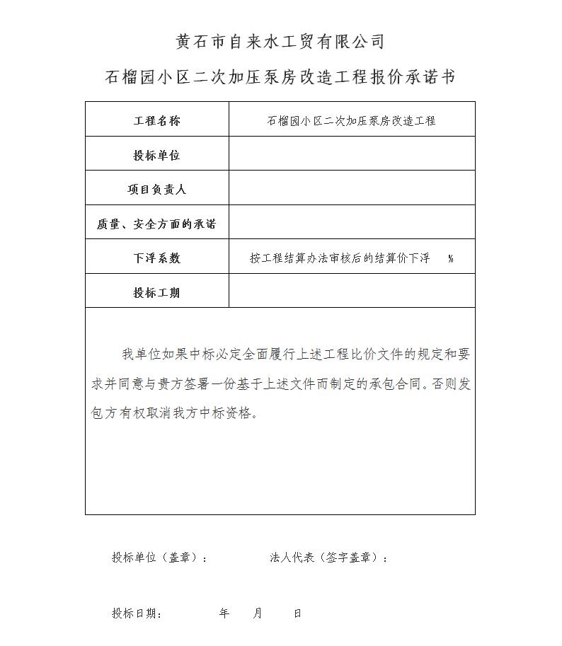 報(bào)價(jià)文件內(nèi)附:工程報(bào)價(jià)承諾書、營(yíng)業(yè)執(zhí)照復(fù)印件、授權(quán)委托書、身份證復(fù)印件。所有證明文件加蓋公章,裝入檔案袋密封并加蓋騎縫章,檔案袋注明石榴園小區(qū)二次加壓泵房改造工程。