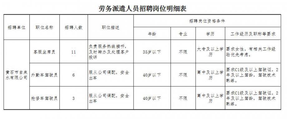 報(bào)名者應(yīng)符合《黃石市自來(lái)水有限公司勞務(wù)派遣人員招聘崗位明細(xì)表》(以下簡(jiǎn)稱(chēng)《崗位表》)規(guī)定的年齡、專(zhuān)業(yè)、學(xué)歷等各項(xiàng)要求。