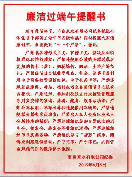 為落實(shí)城發(fā)紀(jì)委嚴(yán)明端午節(jié)期間紀(jì)律通知要求,公司紀(jì)委強(qiáng)化教育提醒,在微信公眾號(hào)、各工作群發(fā)布《廉潔過端午提醒書》,溫馨提醒干部職工自覺做到“十一個(gè)嚴(yán)禁”,全體紀(jì)檢人員加大督促檢查力度,開展紀(jì)律作風(fēng)專項(xiàng)檢查,對(duì)發(fā)現(xiàn)的節(jié)日期間“四風(fēng)”問題快查嚴(yán)處,凈化節(jié)日風(fēng)氣。公司領(lǐng)導(dǎo)在安全生產(chǎn)會(huì)重申節(jié)間紀(jì)律,各黨支部多載體多渠道傳達(dá)紀(jì)律要求,及時(shí)發(fā)放《提醒書》,并組織學(xué)習(xí)了中紀(jì)委端午節(jié)前夕曝光的六起違反中央八項(xiàng)規(guī)定精神典型問題,切實(shí)筑牢廉潔防線,嚴(yán)防“節(jié)日腐敗”、嚴(yán)肅過節(jié)紀(jì)律,確保人人廉潔、清廉過節(jié)。