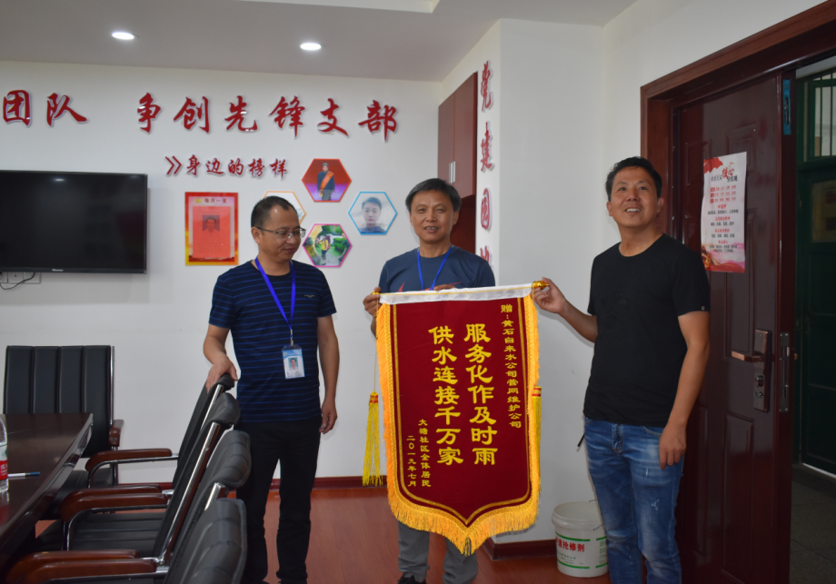 7月18日上午,下陸大塘社區(qū)及居民代表給黃石市自來水有限公司管網(wǎng)維護(hù)公司送來感謝錦旗——“服務(wù)化作及時雨,供水連接千萬家”,感謝該公司連續(xù)三天奮戰(zhàn)工地,解決用戶用水難問題。