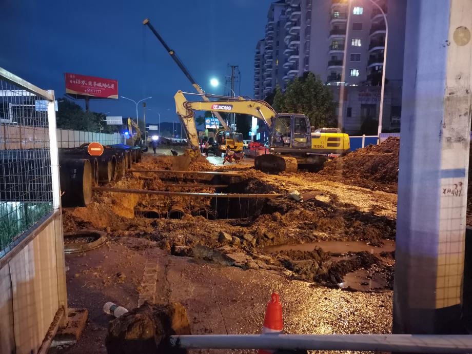 由于天氣等客觀因素,項目部前期已組織施工準備,確保機械、材料、圍護等設施充足,人員現場待命克服雨天困難破路施工,主干道分流后機械進場破路開挖,管道安裝成功迅速完成路面恢復,最大程度降低對市民出行帶來的不便,確保市民假期末回城高峰及節(jié)后上下班正常通行。