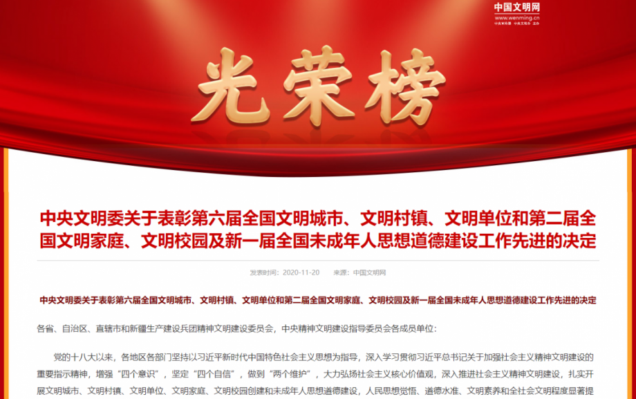 11月20日,《中央文明委關(guān)于表彰第六屆全國(guó)文明城市、文明村鎮(zhèn)、文明單位和第二屆全國(guó)文明家庭、文明校園及新一屆全國(guó)未成年人思想道德建設(shè)工作先進(jìn)的決定》正式公布。