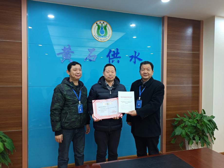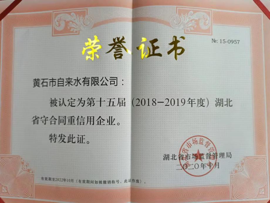12月3日,市市場(chǎng)監(jiān)督管理局向市自來水有限公司頒發(fā)湖北省第十五屆(2018-2019年度)“守合同重信用”企業(yè)榮譽(yù)證書。