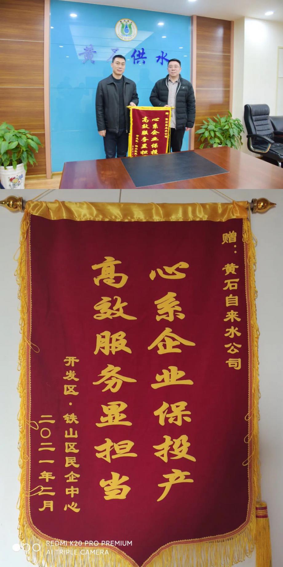 2月8日上午,開發(fā)區(qū)·鐵山區(qū)民企中心專程來到市自來水有限公司贈送錦旗,對公司保障落戶企業(yè)用水,提供主動(dòng)作為、高效周到的服務(wù)表達(dá)謝意。開發(fā)區(qū)·鐵山區(qū)民企中心副主任徐永華代表民企中心授錦旗。公司黨委委員、副總經(jīng)理袁全保代表公司接錦旗。