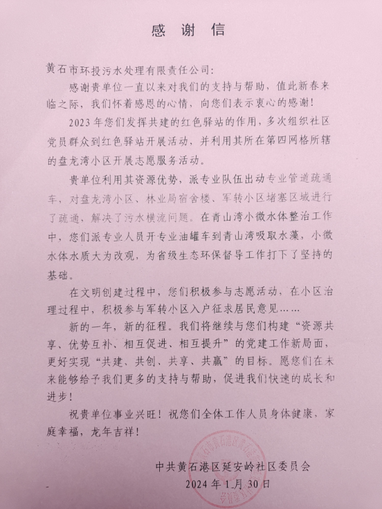 自創(chuàng)建“紅色驛站”以來,我們發(fā)揮技術(shù)優(yōu)勢,為黨員群眾提供管網(wǎng)疏通等志愿服務(wù),截止目前污水公司已派出專業(yè)隊(duì)伍開展志愿疏通服務(wù)15次,疏通惠及社區(qū)群眾1000多戶,下一步污水(排水)公司將以“紅色驛站”為載體,聯(lián)合延安嶺社區(qū),積極擴(kuò)大企業(yè)的社會影響力,為優(yōu)化我市營商環(huán)境展現(xiàn)國企擔(dān)當(dāng)。