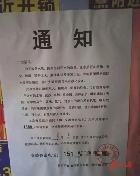 馬先生說,他看到小區(qū)的門口貼著一張通知,上面寫著黃石市某自來水安裝工程公司在該小區(qū)開展業(yè)務,只需要掏1380元,就可安裝“OR反滲透直飲機”。聽到自家的水質(zhì)不達標后,馬先生有些擔心家人飲用自來水影響健康,可又覺得要花1380元不劃算,于是致電向黃石市水務集團,質(zhì)疑安裝費過高。