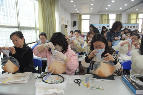 女職工們或是專心注入細(xì)沙,或是嘗試用多種顏色細(xì)沙混合放入,細(xì)沙因?yàn)榱Χ取?shù)量的不同,顯現(xiàn)出形態(tài)各異、造型別致的形狀。大家認(rèn)真地投入自己的創(chuàng)作中,不時(shí)欣賞著身邊人的畫作,精心設(shè)計(jì)間,“橫看成嶺側(cè)成峰,遠(yuǎn)近高低各不同”,翻轉(zhuǎn)玻璃,彩色石沙在兩片玻璃間緩緩流動(dòng),慢慢沉淀成另外一副模樣,這正是流沙畫的魅力所在。